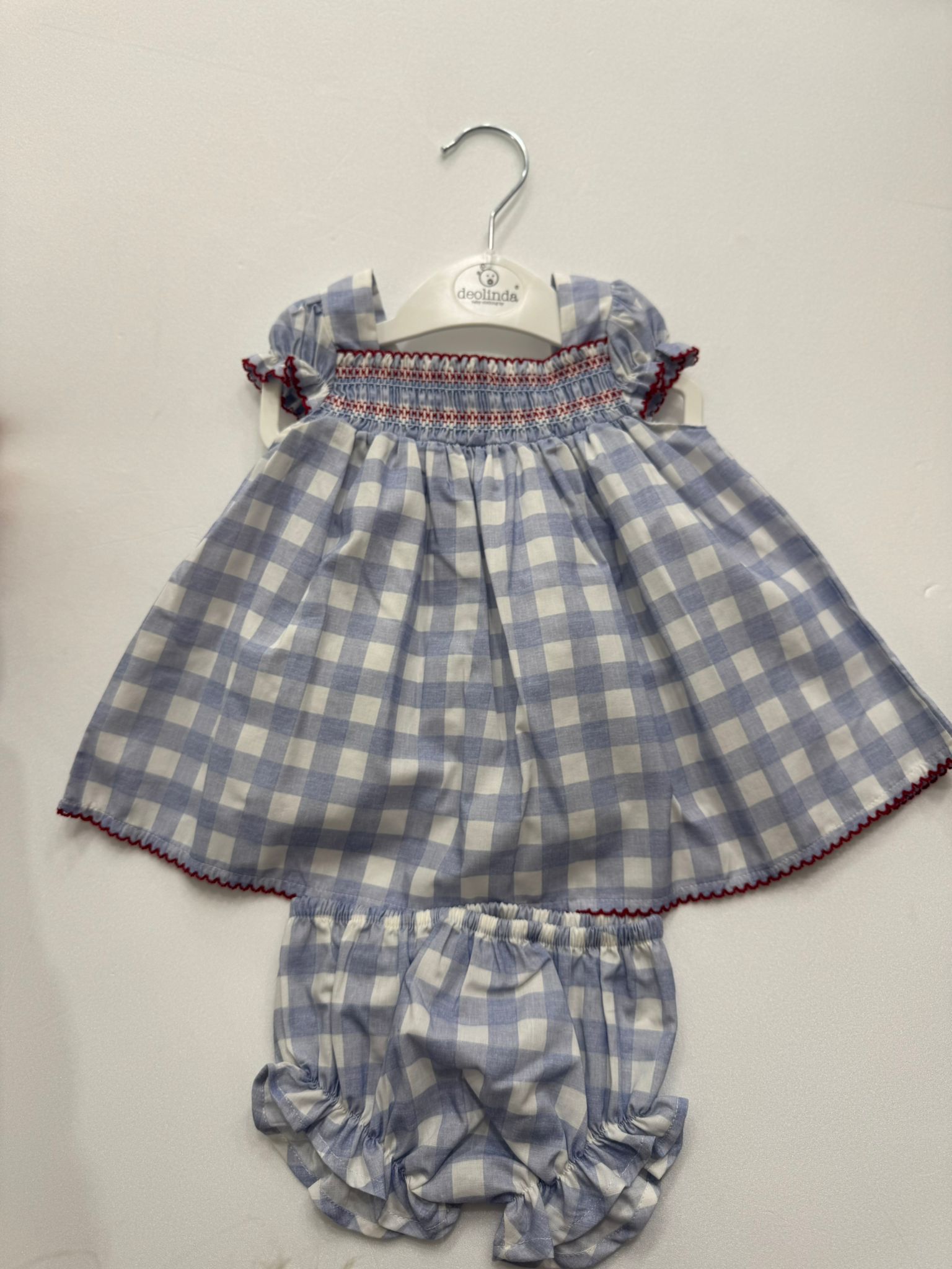 L’abitino presenta un raffinato corpino arricciato con lavorazione smock e ricami a contrasto, maniche corte con volant e rifiniture rosse che aggiungono un tocco elegante e artigianale. La culotte abbinata, con elastico in vita e sulle gambe, garantisce comfort e libertà di movimento.