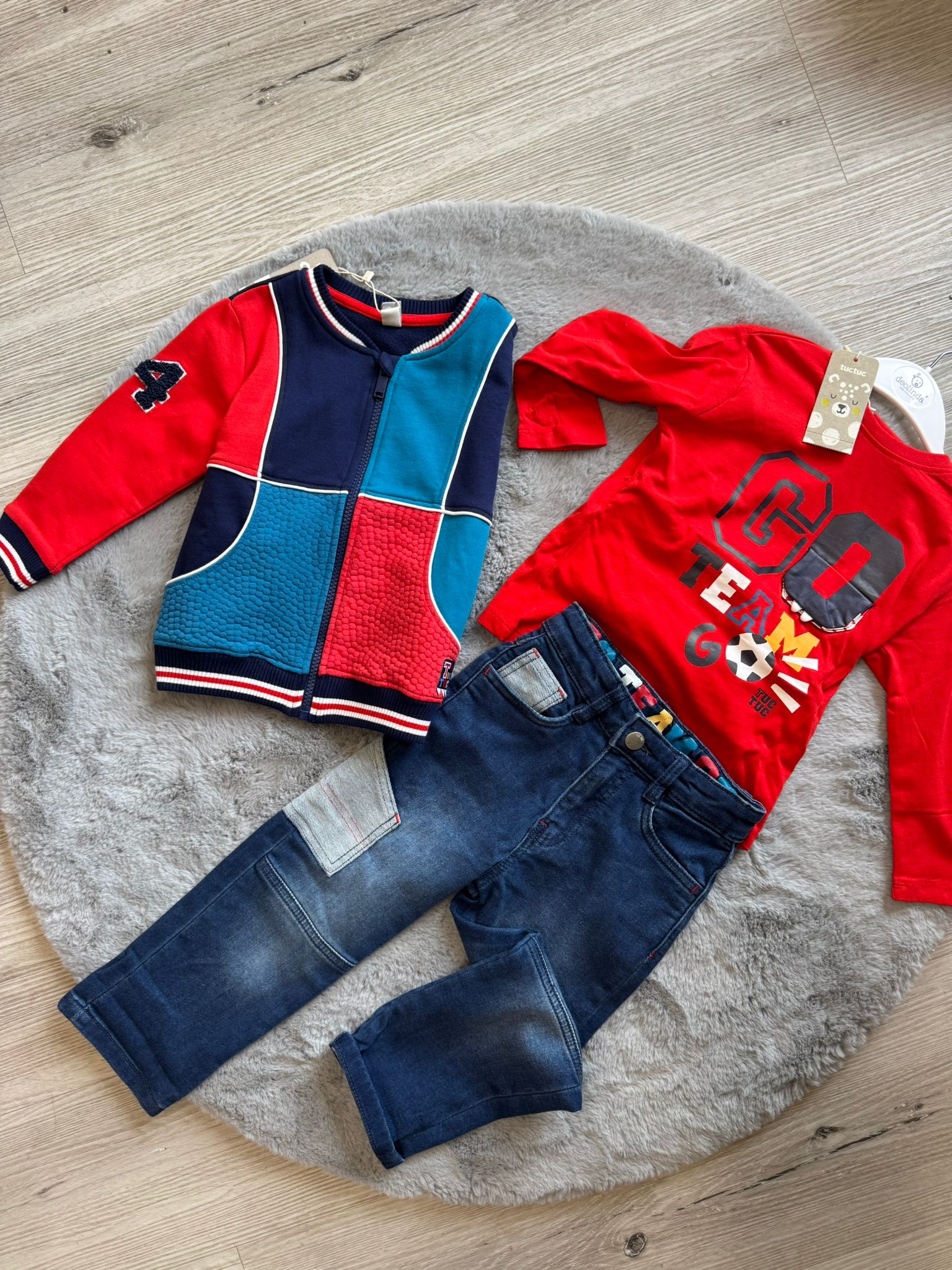 La giacca con zip frontale è realizzata in tessuto morbido e confortevole, con design a blocchi di colore rosso, blu e azzurro e dettagli a contrasto che richiamano lo stile college. La maglia rossa a manica lunga presenta una stampa grafica dinamica a tema sportivo, mentre il jeans completa il look con una vestibilità comoda e dettagli curati tipici del brand.