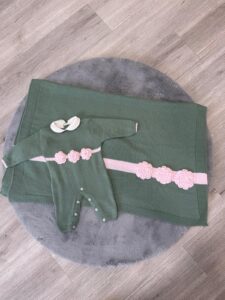 La tutina presenta una raffinata applicazione floreale in rilievo sul davanti, abbinata a una fascia decorativa sulla copertina, per un effetto armonioso e ricercato. Il colletto in contrasto aggiunge un tocco di dolce eleganza, mentre la chiusura con bottoncini sul fondo facilita il cambio.