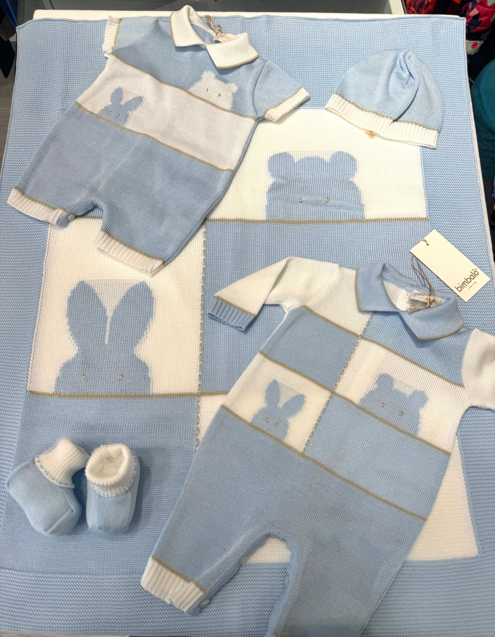 Esclusivo set nascita e uscita Bimbalò, realizzato in pregiato filo di alta qualità, pensato per offrire al neonato comfort, stile e delicatezza sin dai primi giorni.